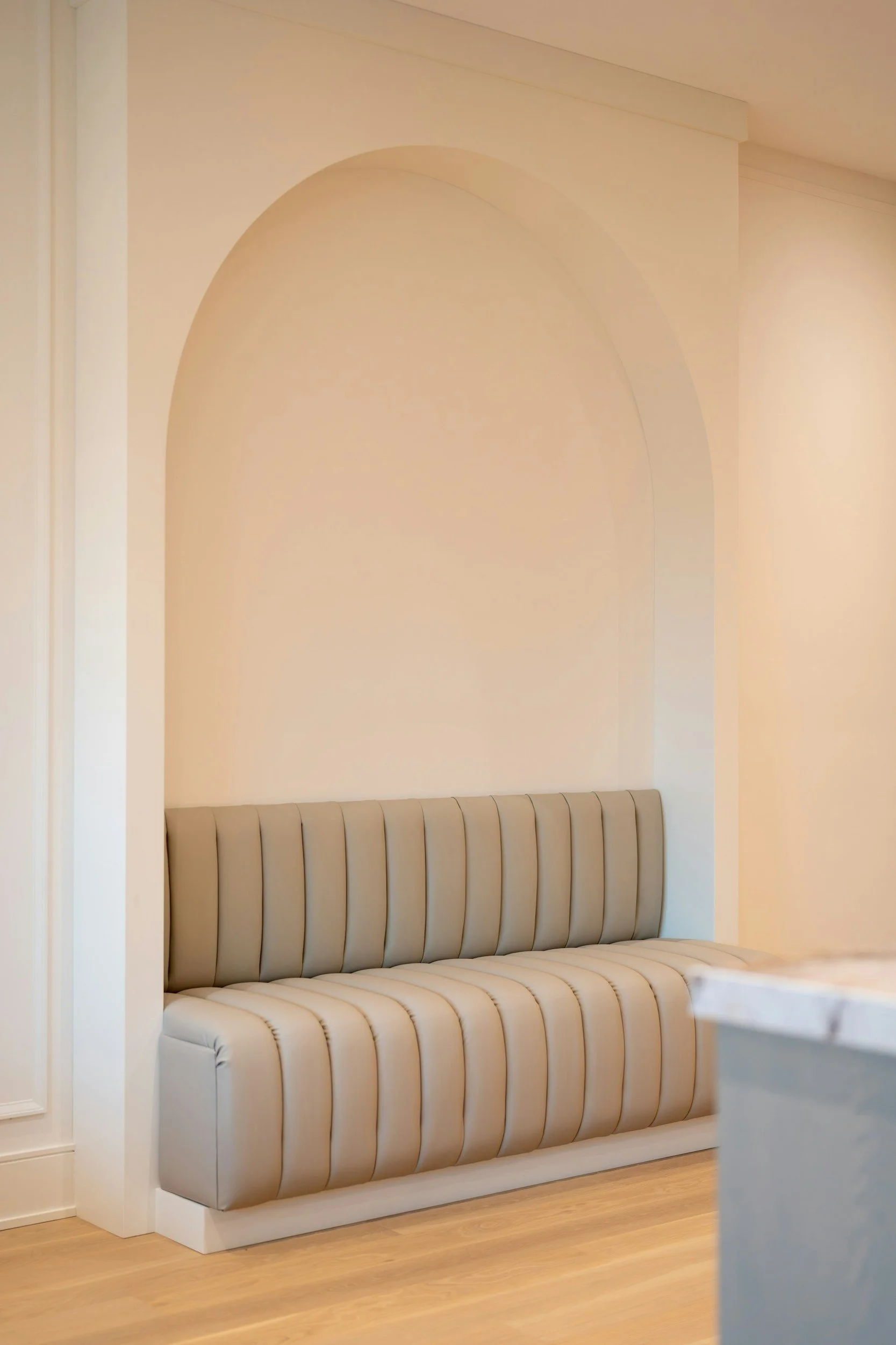 The most effective partition is the one that transforms the room. We favor a "monolithic" approach where the kitchen becomes part of the home's permanent architecture.