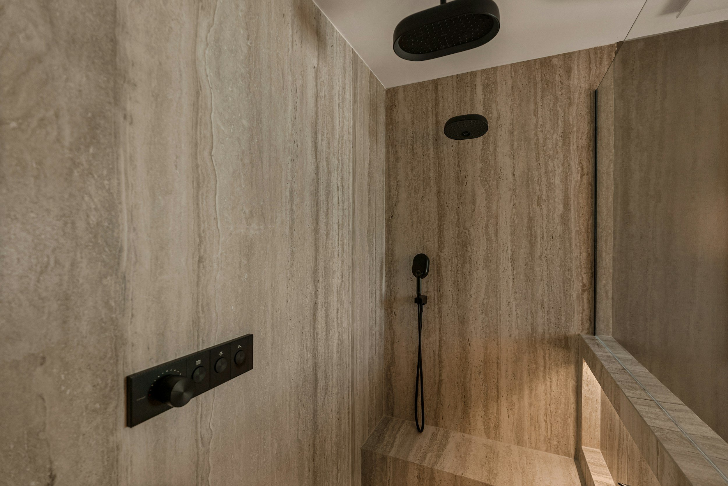 Floor to ceiling marble shower enclosure featuring integrated niche lighting.