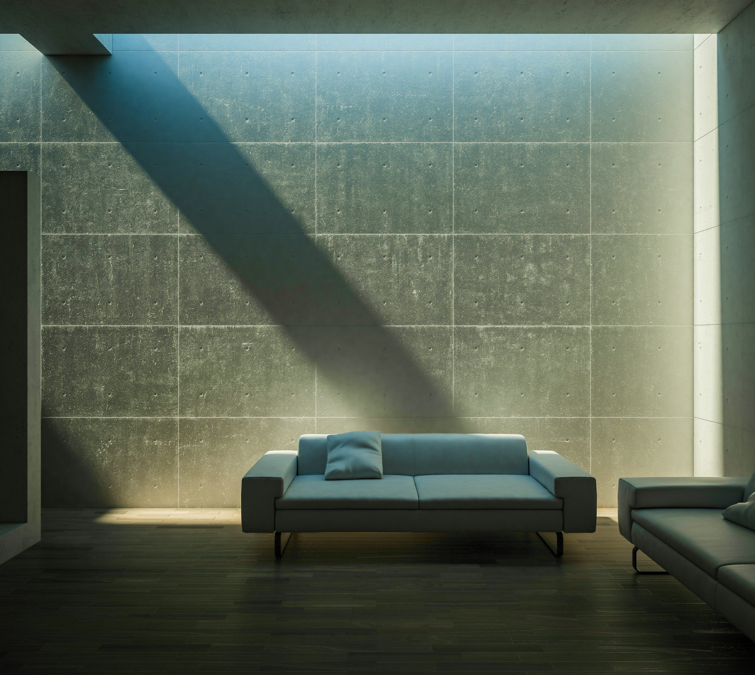 Living room defined by expansive stone walls and flooring, featuring two low profile sofas and abundant negative space illuminated by natural sunlight.