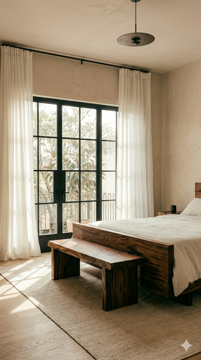 • The Hand Cast Glow: Low slung, oxidized bronze pendants over the table create an "island of light" that draws the eye inward, naturally erasing the functional zones of the house from view.