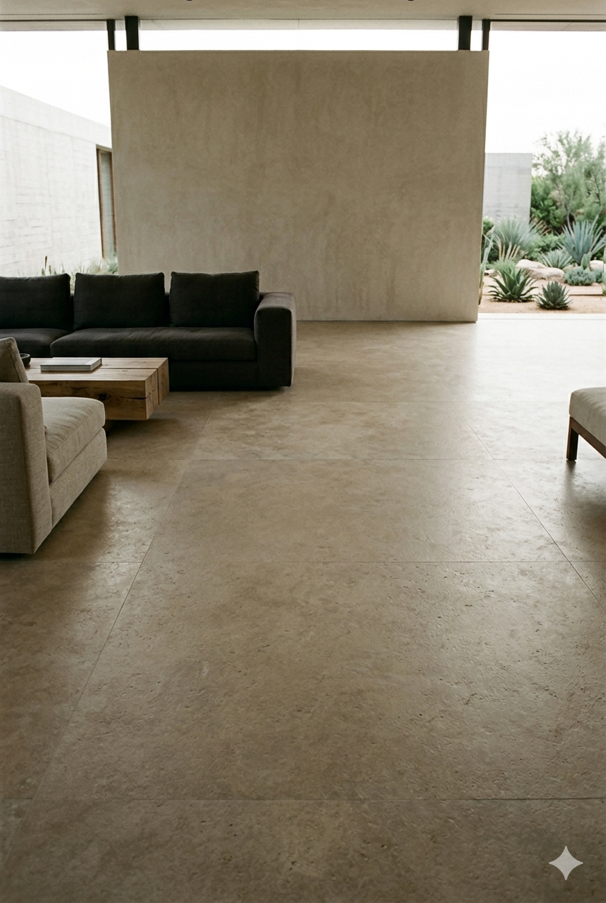 • Low Slung Lounging: Deep, architectural chairs in weather resistant hardwoods or matte finished metals, paired with high performance cushions that offer an interior grade "sink." These pieces are designed for laying, their heavy silhouettes holding their own against the expansive stone floors. This seamless flow relies on The Grit of the Floor, where the same honed limestone used in the Great Room extends into the courtyard to blur the boundary between shelter and sky.