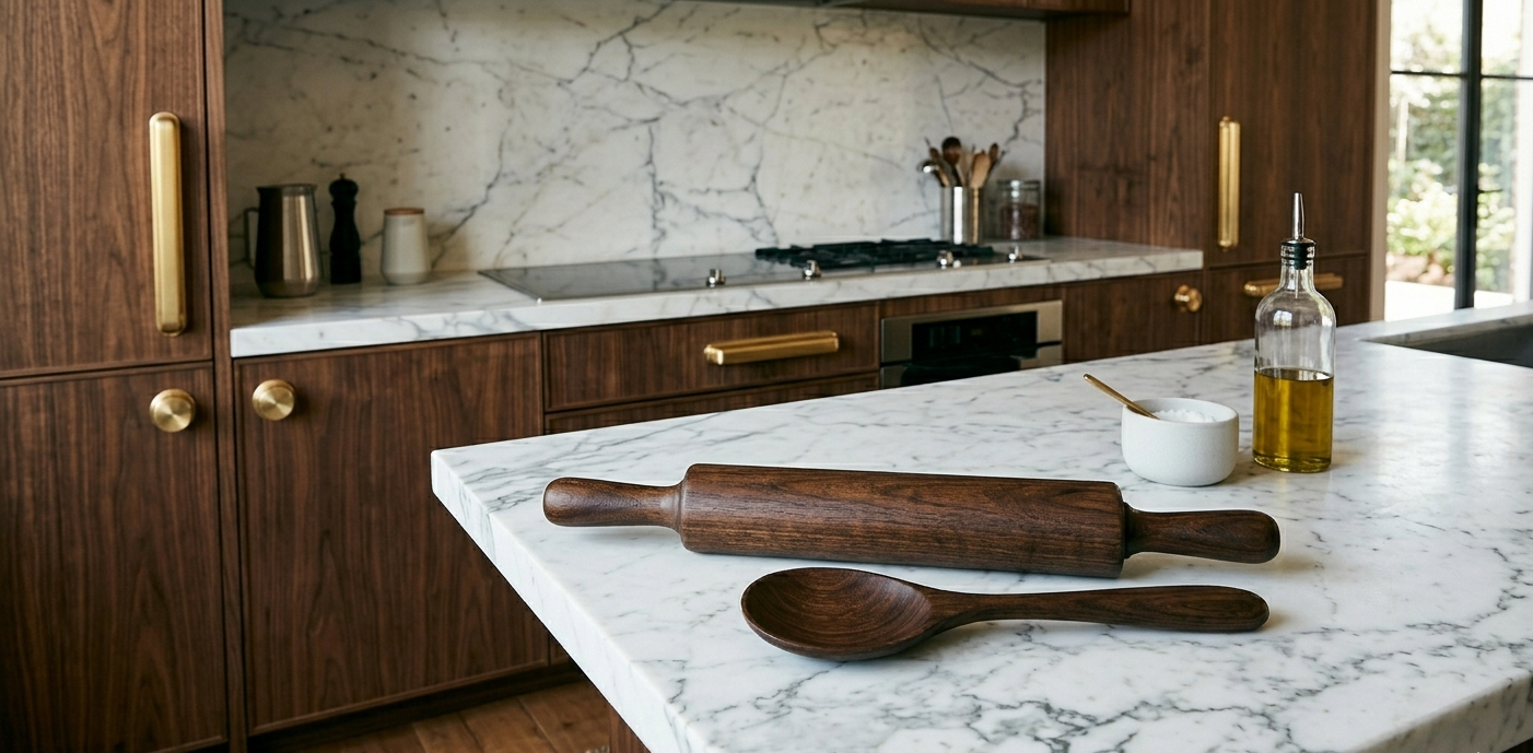 Tzalam wood rolling pin and oversized spoon on a white marble kitchen island with modern walnut cabinetry and brass hardware.