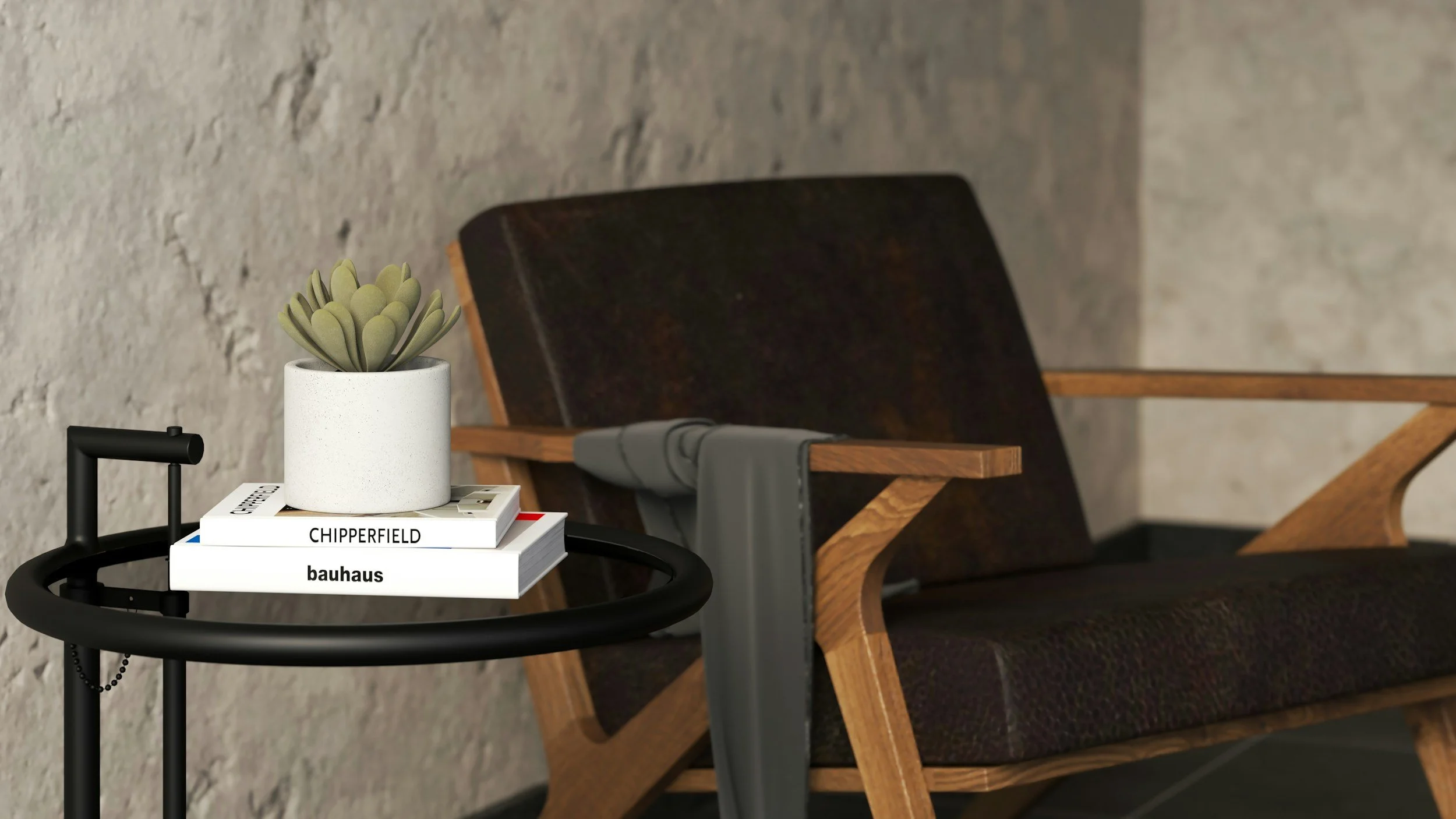 Modern wood and leather chair in a stone walled reading corner, featuring a draped throw blanket and a side table with books.