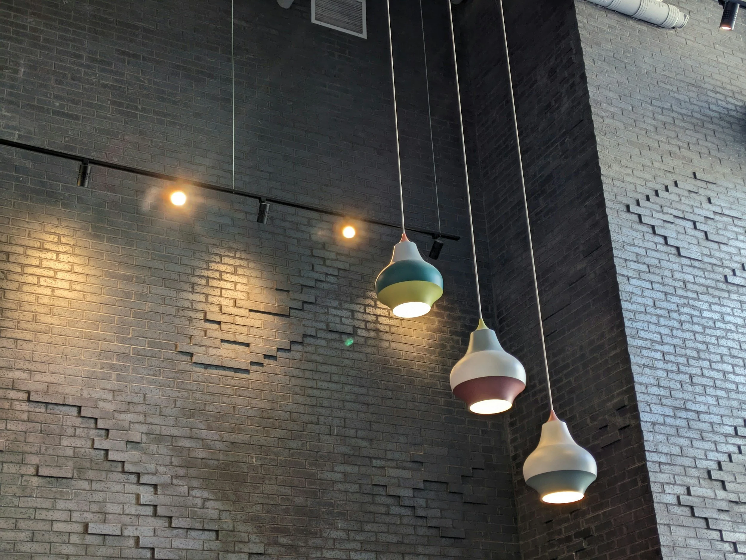 Vertical accent lighting from a large three pendant chandelier.