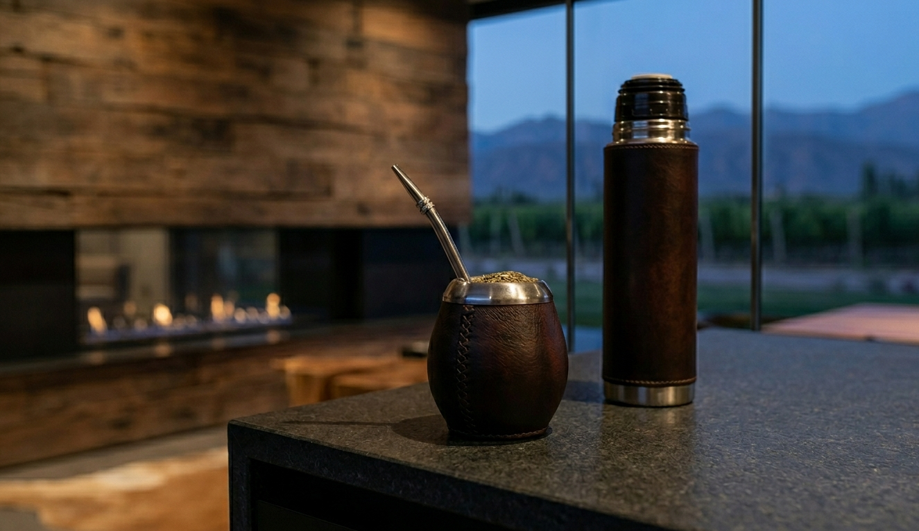 The Technical Setup: You need the Leather wrapped Mate Gourd and the Stainless Steel Bombilla (the filtered straw). The leather holds the thermal mass of the water, while the bombilla ensures a high clarity infusion. It’s the digestive reset that clears the richness of the beef and signals the peace of the evening.